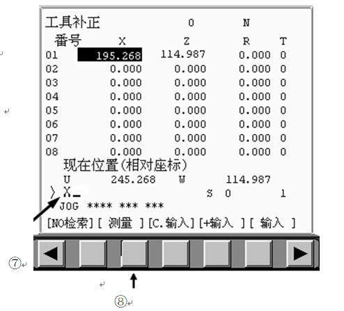 接下来对基准刀的x方向,将刀具的刀位点对齐到工件的外圆表面或者切一小段外圆,然后手动退刀,注意仅仅在z方向退刀,x方向不动,用游标卡尺或千分尺测量工件试切后的外圆的尺寸,根据这个尺寸计算出刀具的长度补偿值记入系统,这样基准刀具就对好了。其他刀具的对刀重复上述操作。对刀结束后,还要进行对刀正确性进行检验。检验的方法是用MDI方式将刀具上的对刀参考点移到工件的右端的外圆处,首先检验Z向对刀的正确性。在MDI方式下,输入T0101;G00Z0;按下insert键-循环启动键,再切换到手摇模式,保持Z不变,X方向摇刀具接近工件,看刀尖是否在端面上。接着验证X方向的正确性,在手摇模式下,输入T0101;G00X0;按下insert键-循环启动键,再切换到手摇模式,保持X不变,Z方向摇刀具接近工件,看刀尖是否在工件回转中心,如果在就说明对刀正确,否则说明对刀有误。